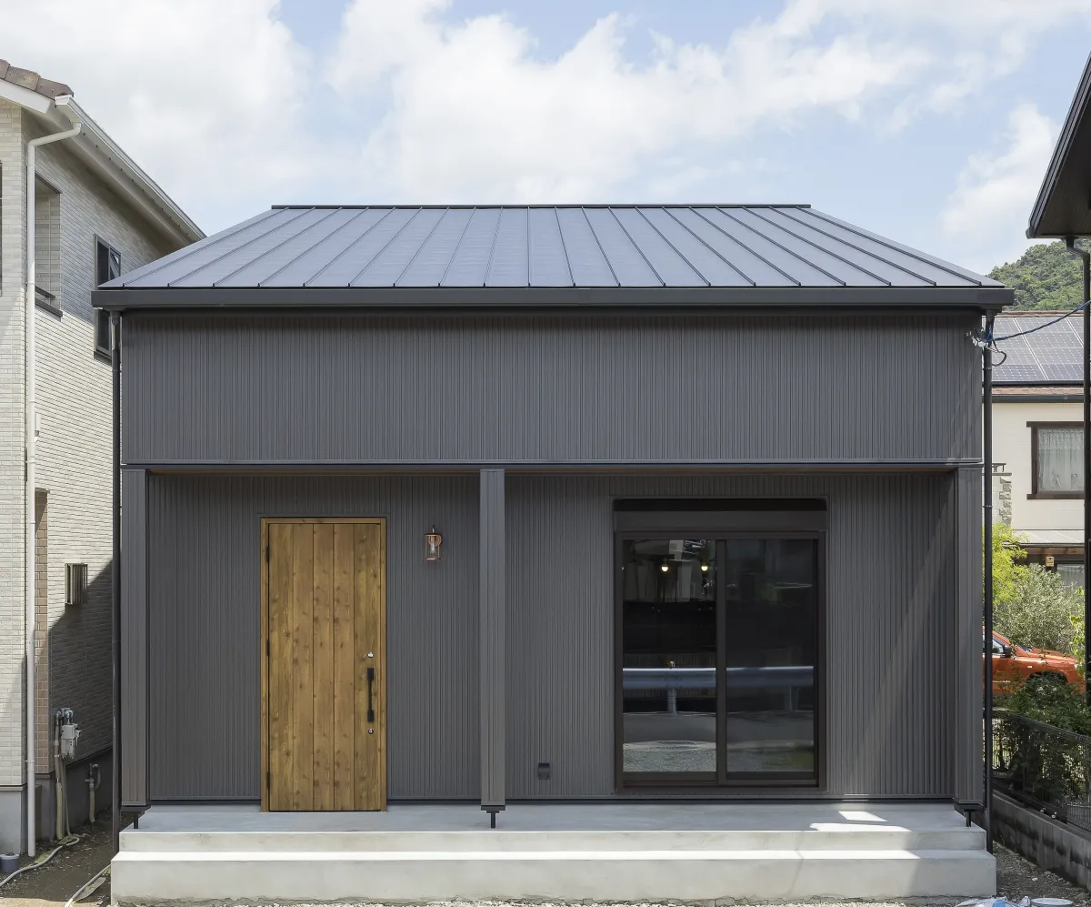 「平屋っぽく」とのお客様の要望を叶え、大屋根で平屋に見える二階建てです。